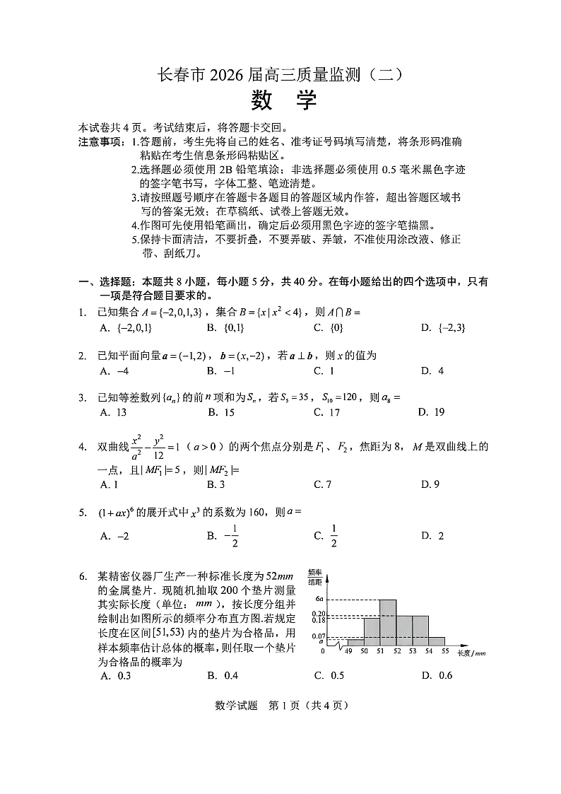 吉林省长春市2026届高三年级质量监测(二)数学.pdf