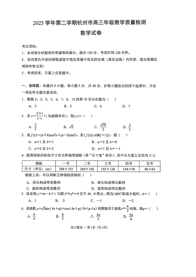 2025学年第二学期杭州市高三年级教学质量检测 数学.pdf