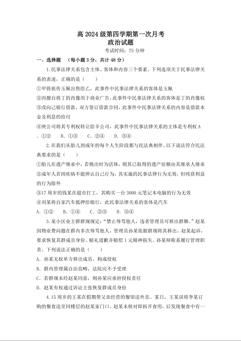 四川省南充高级中学2025-2026学年高二下学期第一次月考 政治.docx