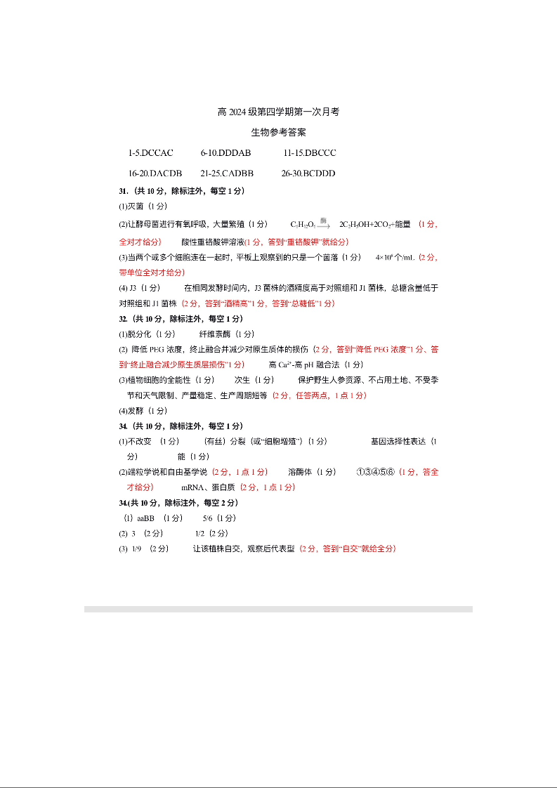四川省南充高级中学2025-2026学年高二下学期第一次月考 生物答案.doc