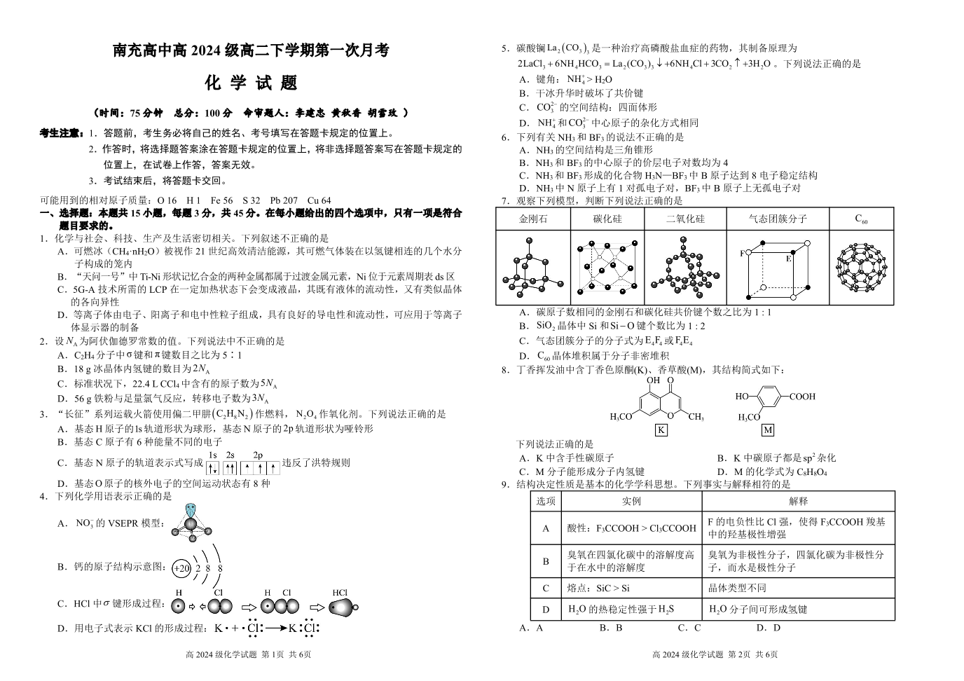 四川省南充高级中学2025-2026学年高二下学期第一次月考 化学.pdf