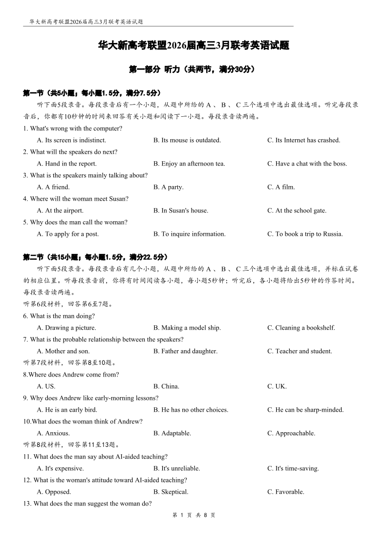华大新高考联盟2026届高三3月教学质量测评 英语试题(含答案).pdf