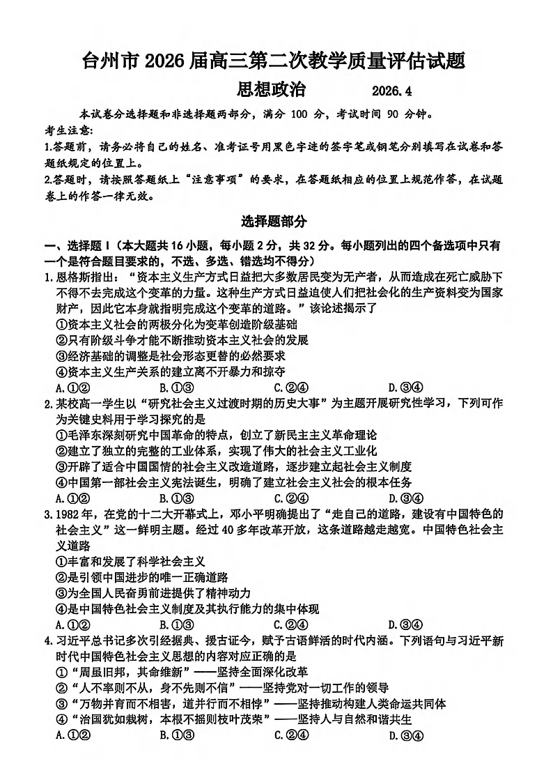 台州市2026届高三第二次教学质量评估试题 政治.pdf