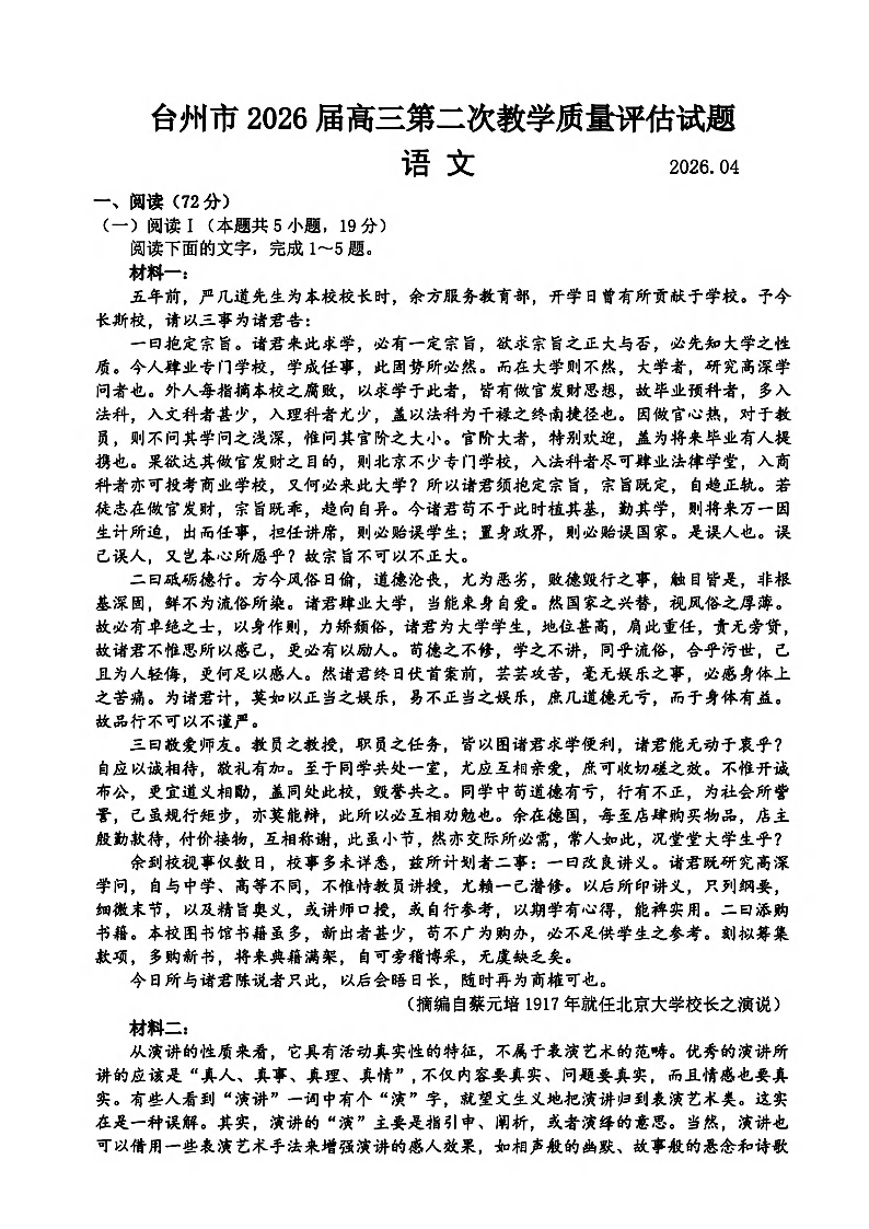 台州市2026届高三第二次教学质量评估试题 语文.pdf