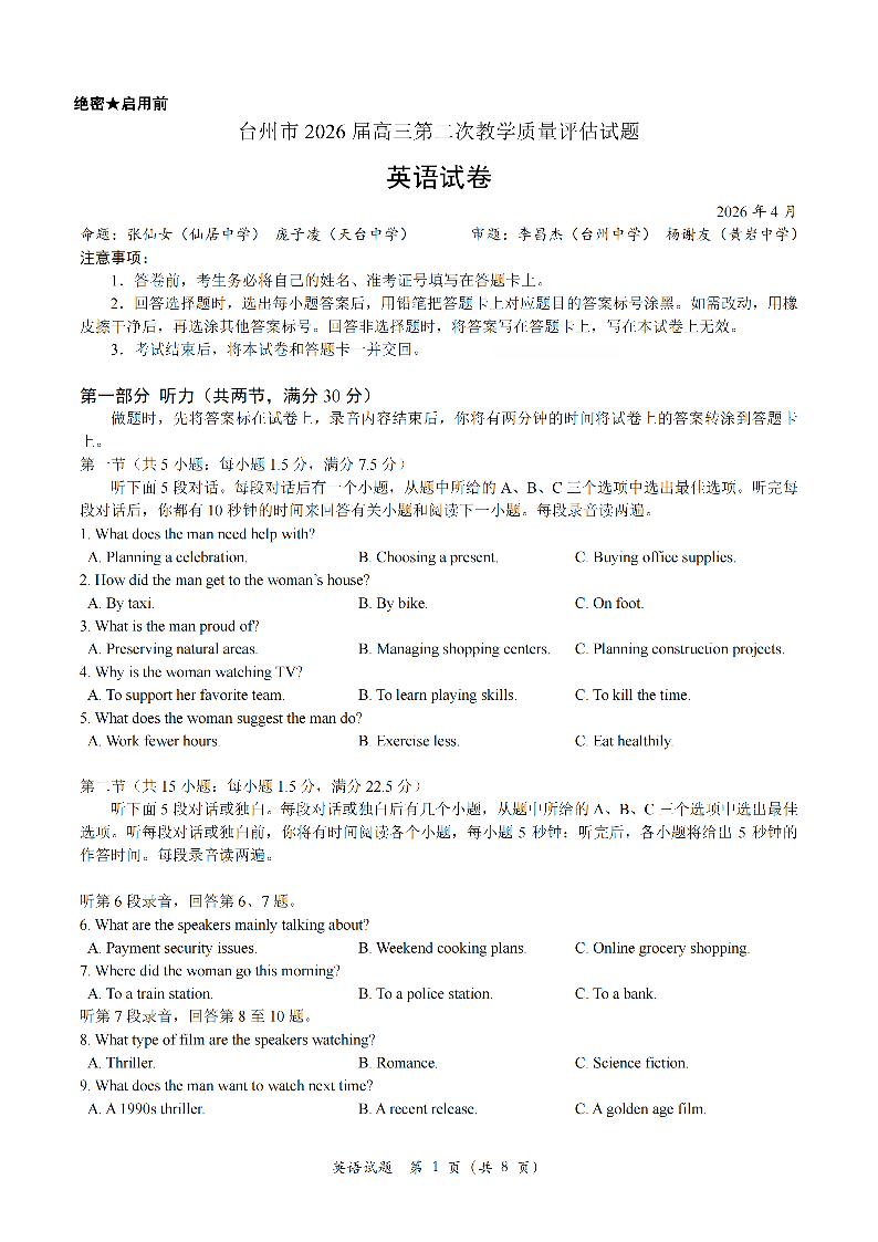 台州市2026届高三第二次教学质量评估试题 英语.pdf