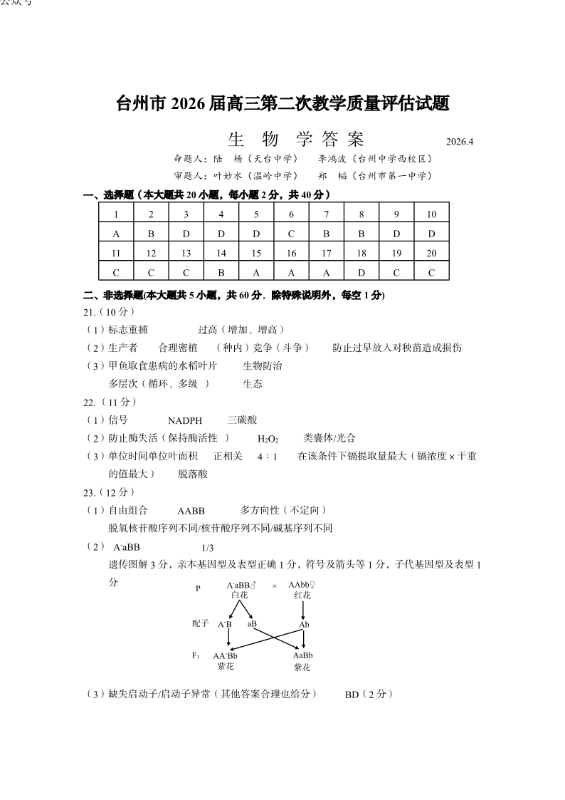 台州市2026届高三第二次教学质量评估试题 生物答案.pdf