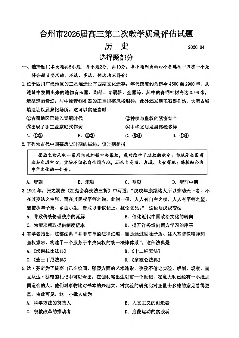 台州市2026届高三第二次教学质量评估试题 历史.pdf