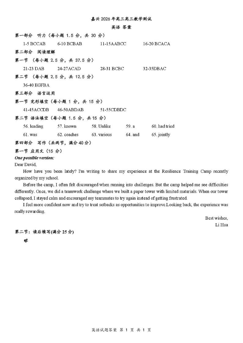 浙江省嘉兴市2026届高三下学期4月教学测试(嘉兴二模)英语答案.pdf