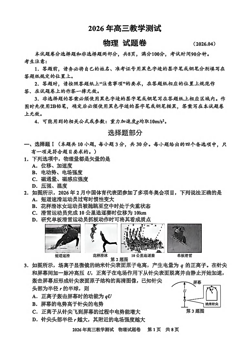 浙江省嘉兴市2026届高三下学期4月教学测试(嘉兴二模)物理.pdf