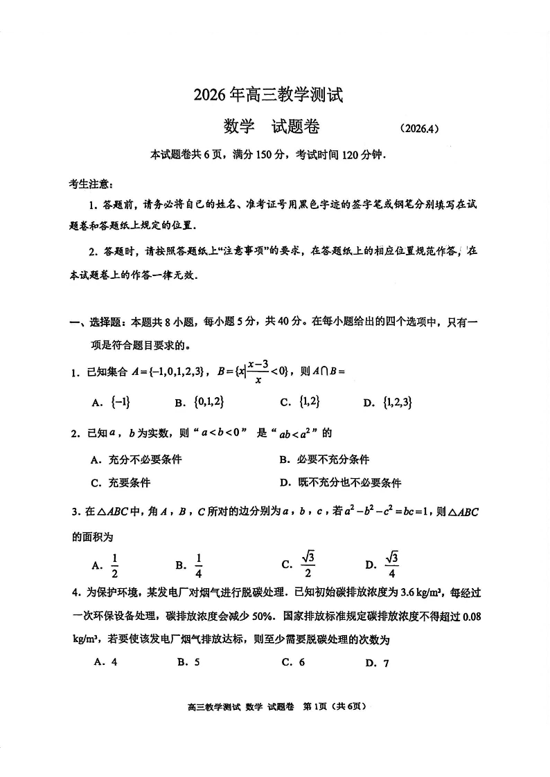 浙江省嘉兴市2026届高三下学期4月教学测试(嘉兴二模)数学.pdf