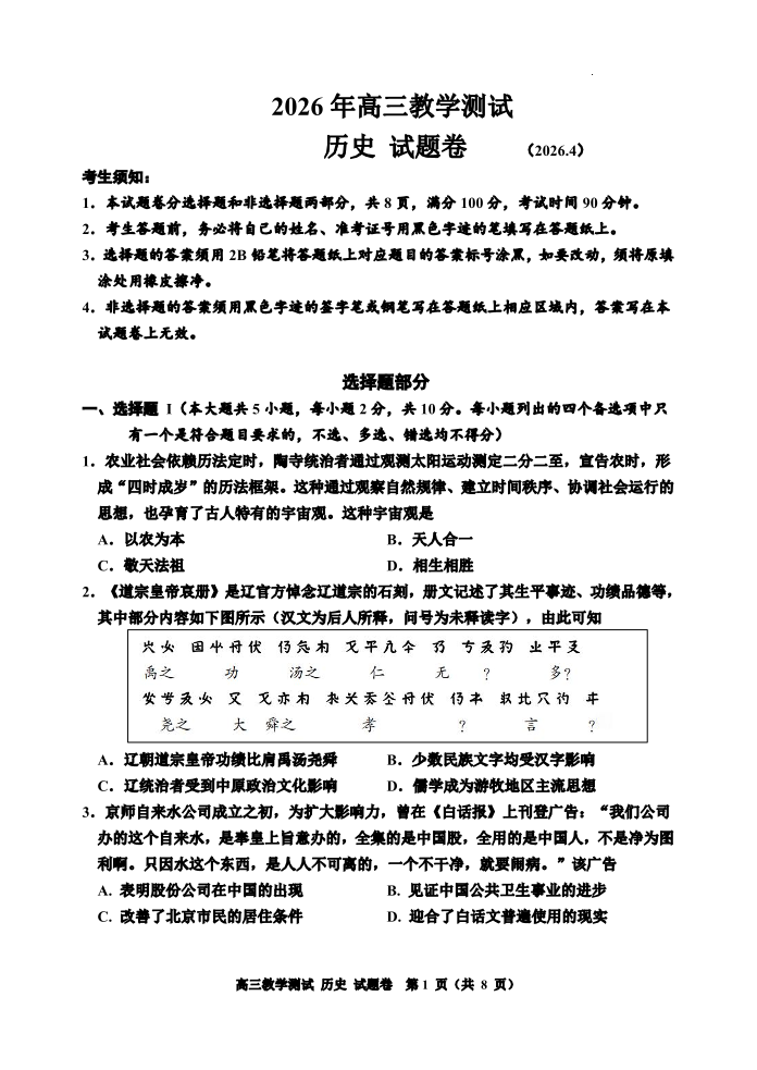 浙江省嘉兴市2026届高三下学期4月教学测试(嘉兴二模)历史.pdf