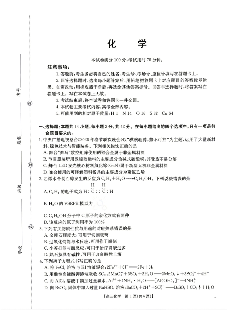 汉中市2026届普通高中高三年级第二次教学质量检测考试 化学试题(含答案).pdf