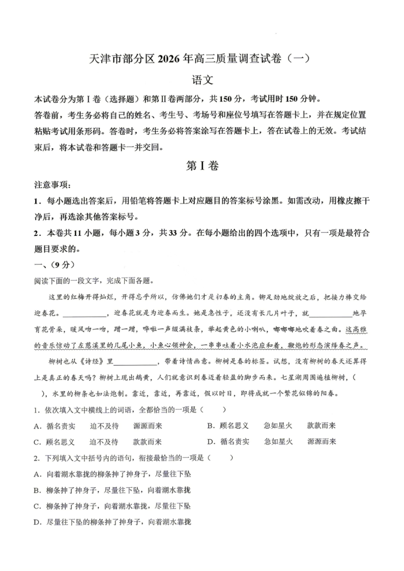 天津市部分区2026年高三质量调查试卷(一)语文试题(含答案).pdf