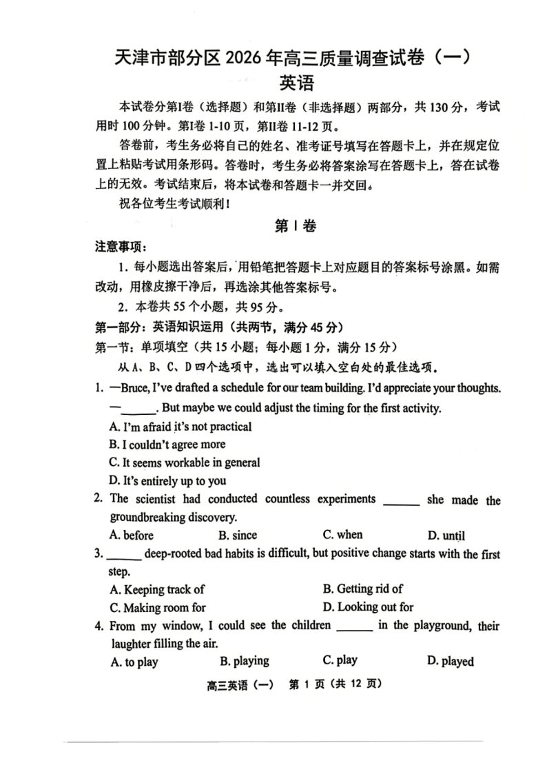 天津市部分区2026年高三质量调查试卷(一)英语试题(含答案).pdf