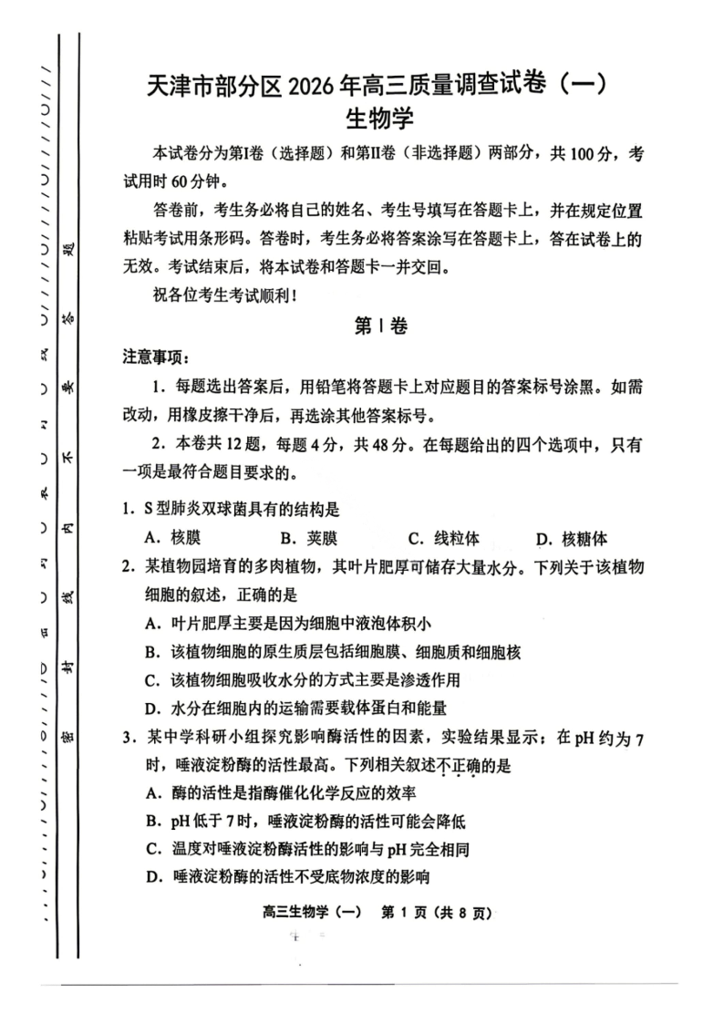 天津市部分区2026年高三质量调查试卷(一)生物试题(含答案).pdf
