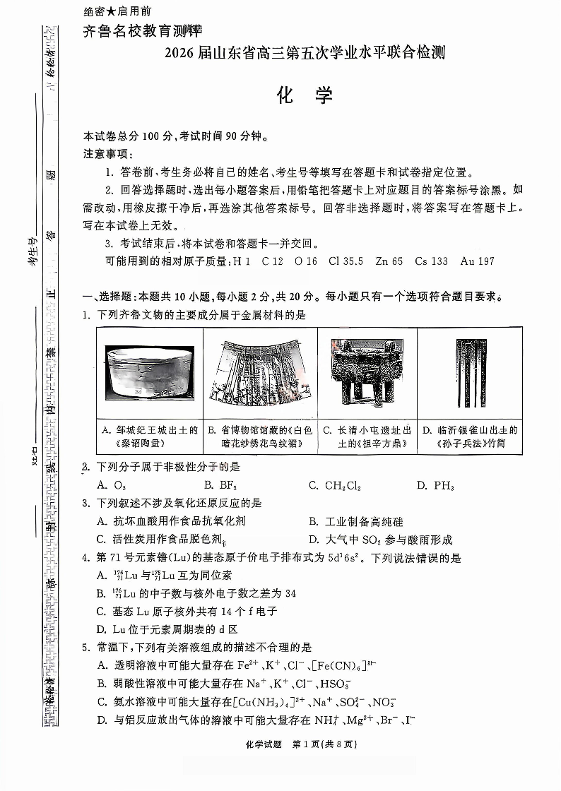 齐鲁名校大联考2026届山东省高三年级第五次学业水平联合检测 化学.pdf