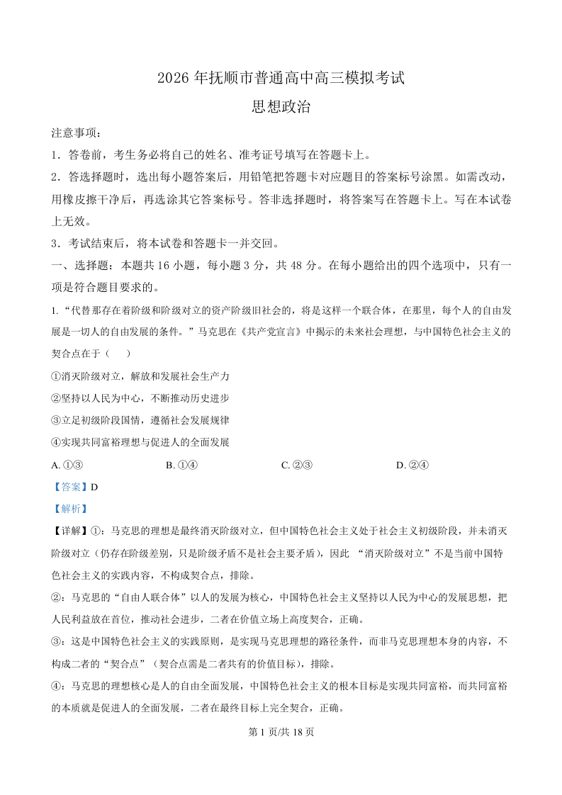 辽宁省抚顺市六校协作体2026届高三下学期一模考试 政治答案.docx