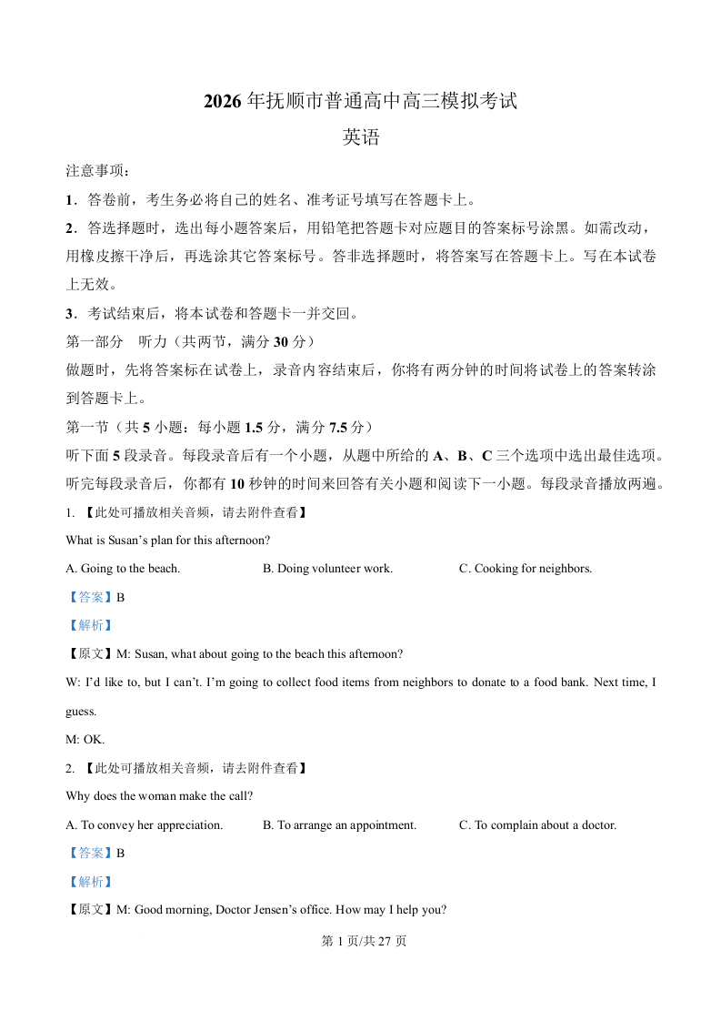 辽宁省抚顺市六校协作体2026届高三下学期一模考试 英语答案.docx
