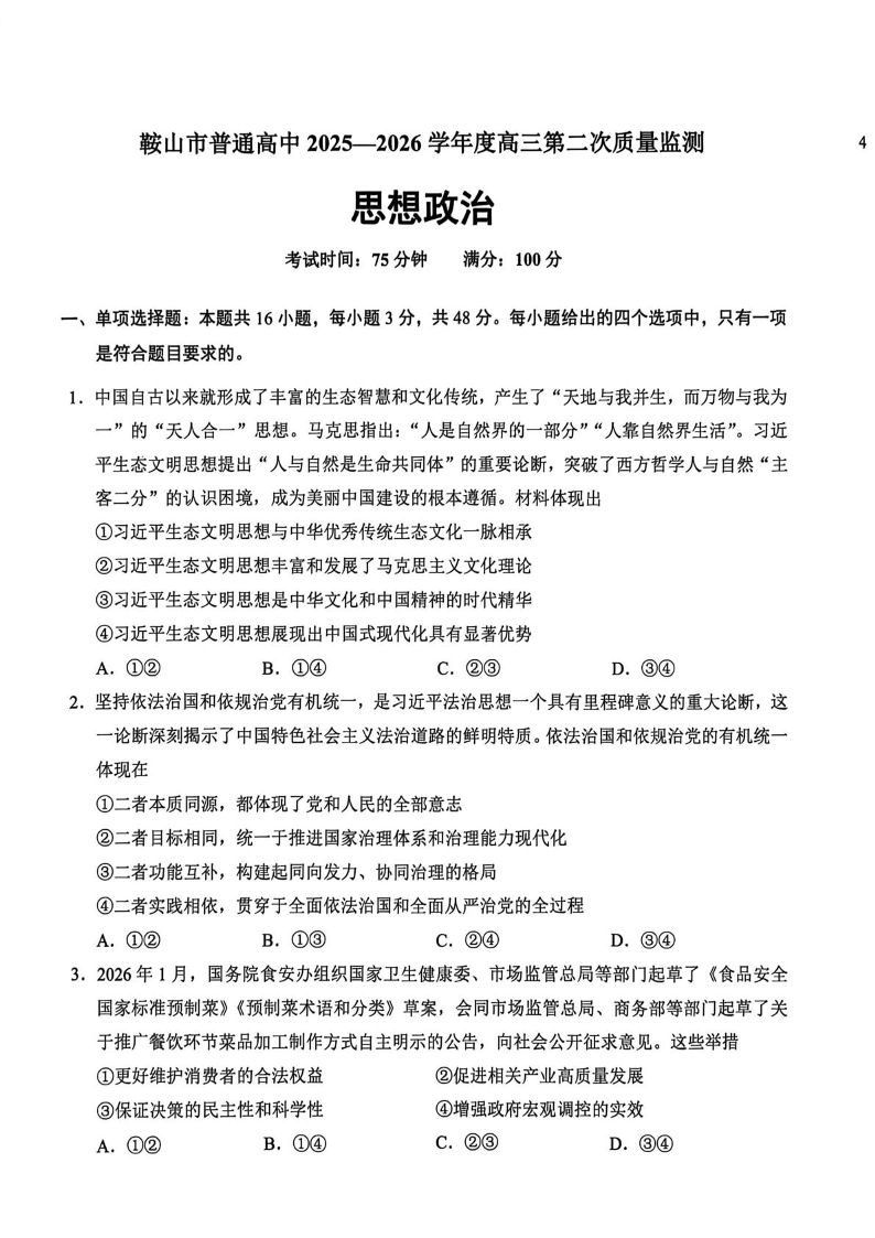 鞍山市普通高中2026届高三第二次质量监测 政治.pdf