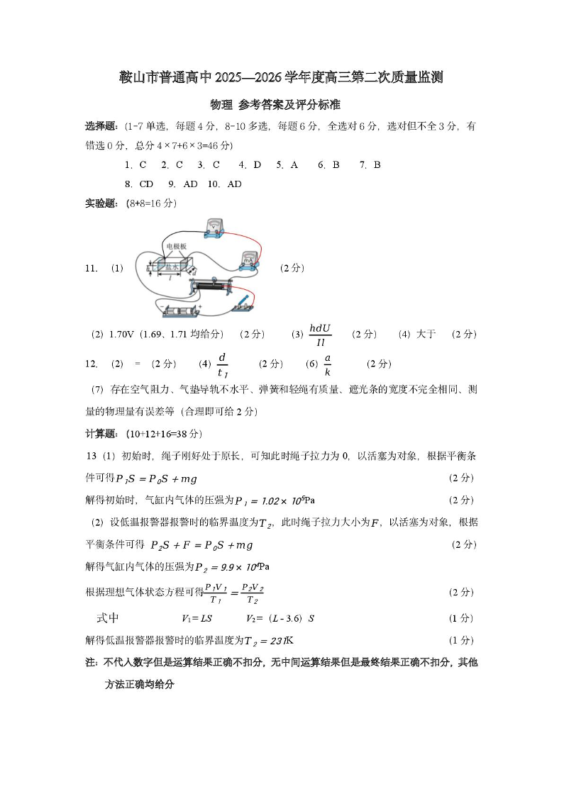 鞍山市普通高中2026届高三第二次质量监测 物理答案.pdf