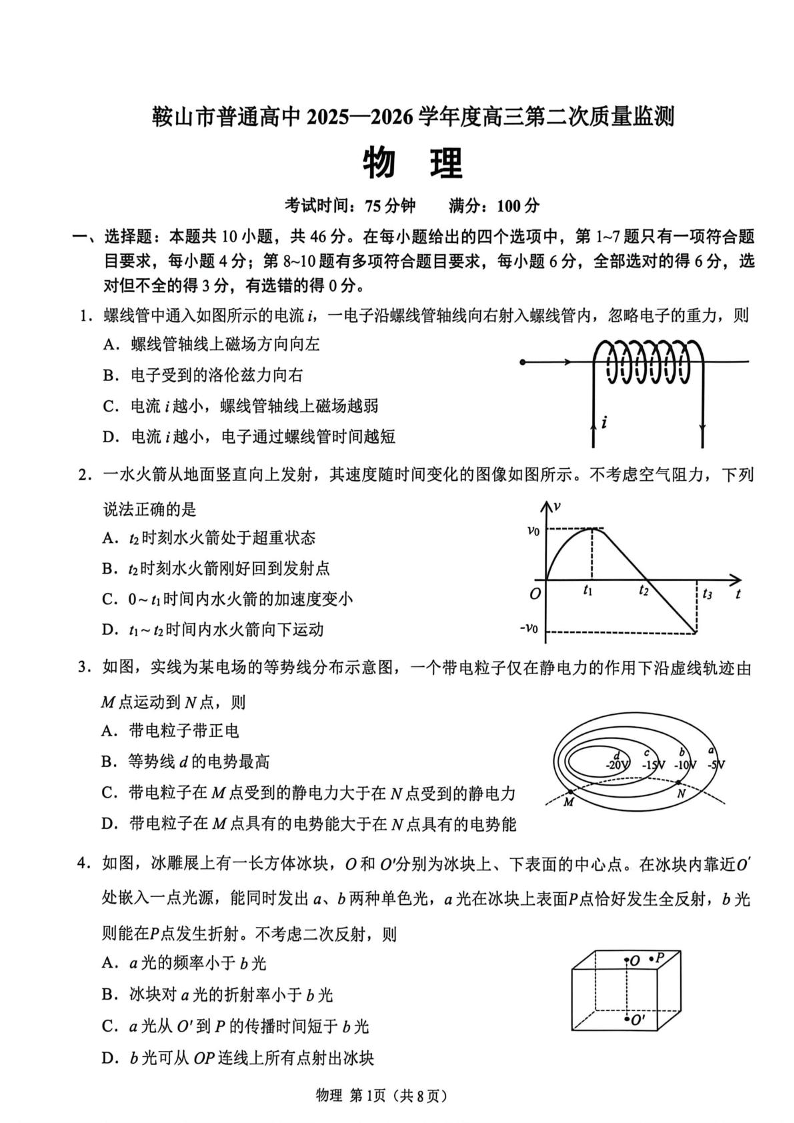 鞍山市普通高中2026届高三第二次质量监测 物理.pdf