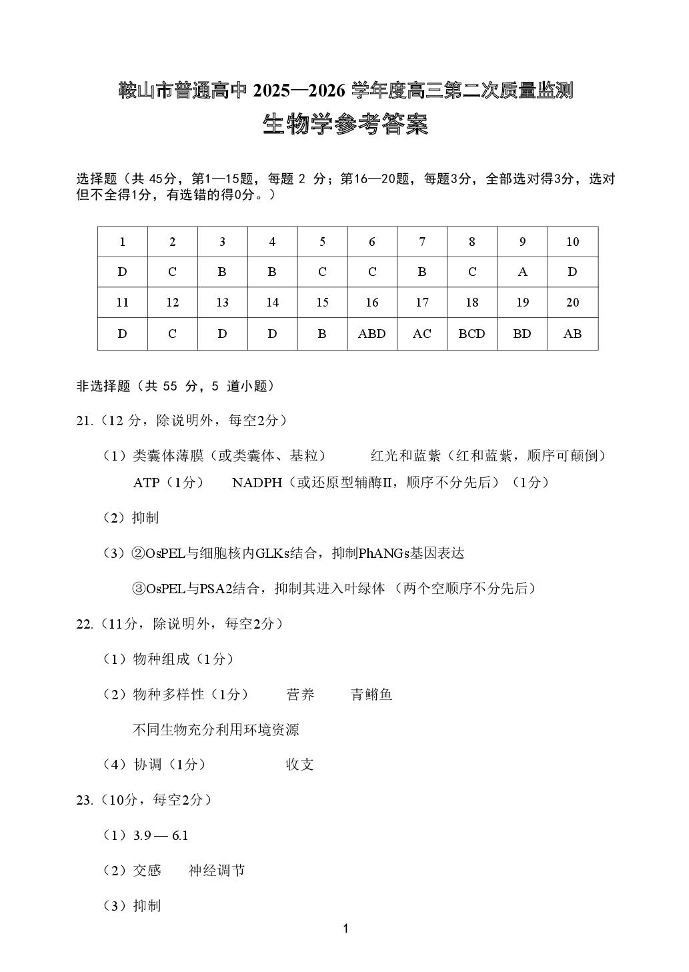 鞍山市普通高中2026届高三第二次质量监测 生物答案.pdf