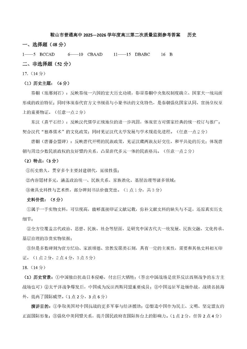 鞍山市普通高中2026届高三第二次质量监测 历史答案.pdf
