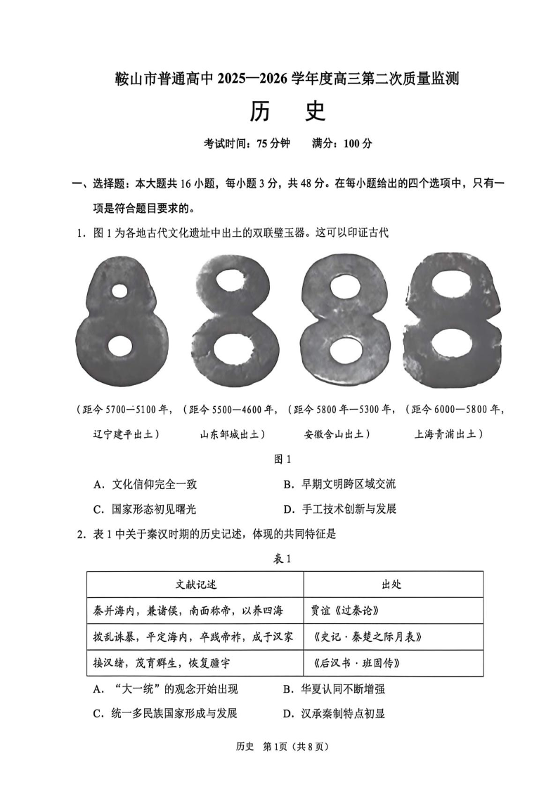 鞍山市普通高中2026届高三第二次质量监测 历史.pdf