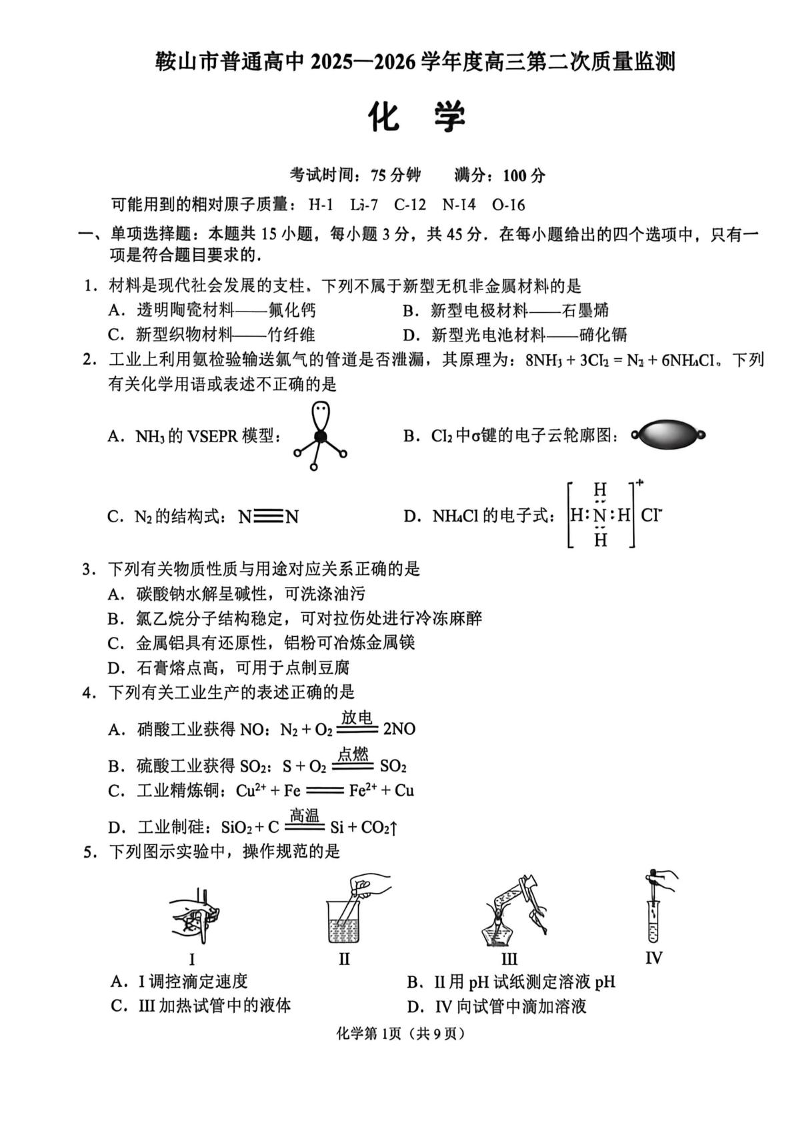 鞍山市普通高中2026届高三第二次质量监测 化学.pdf