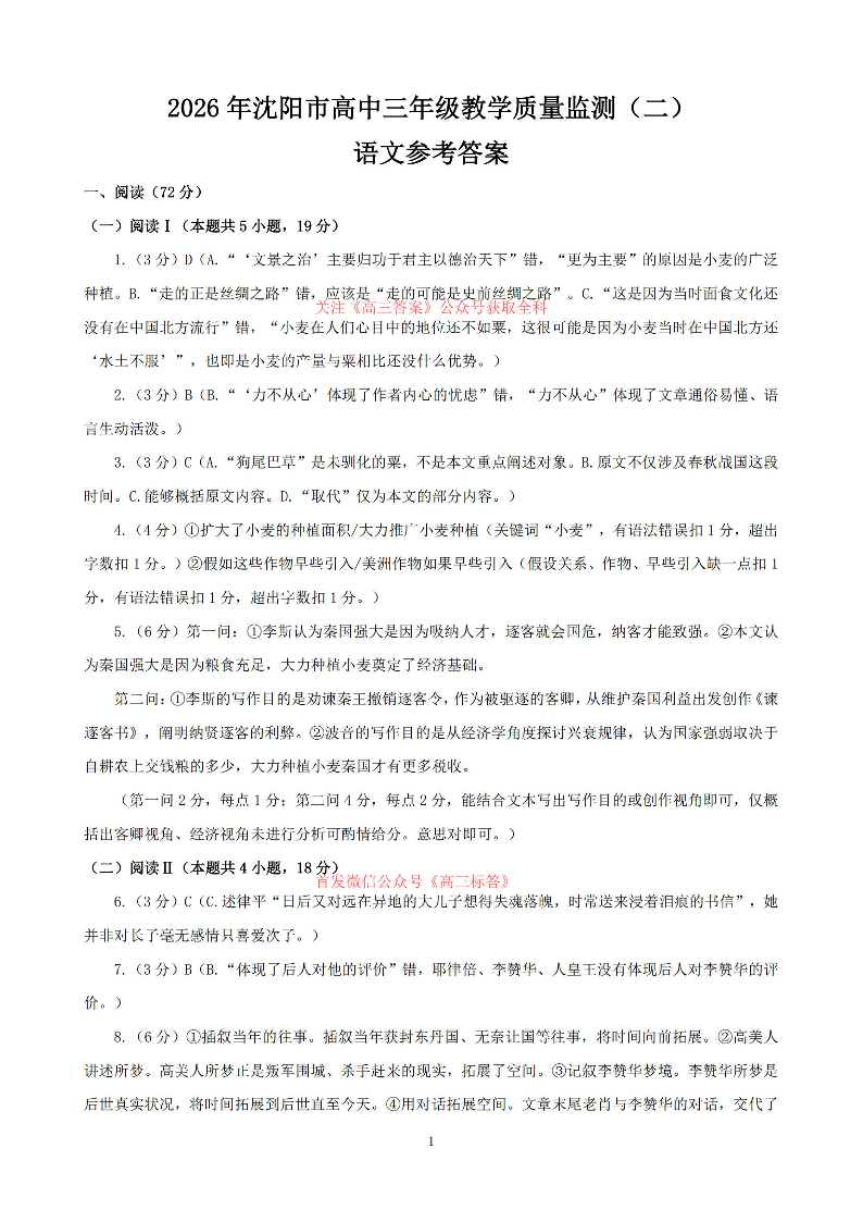 2026年沈阳市高中三年级教学质量监测(二)语文答案.pdf