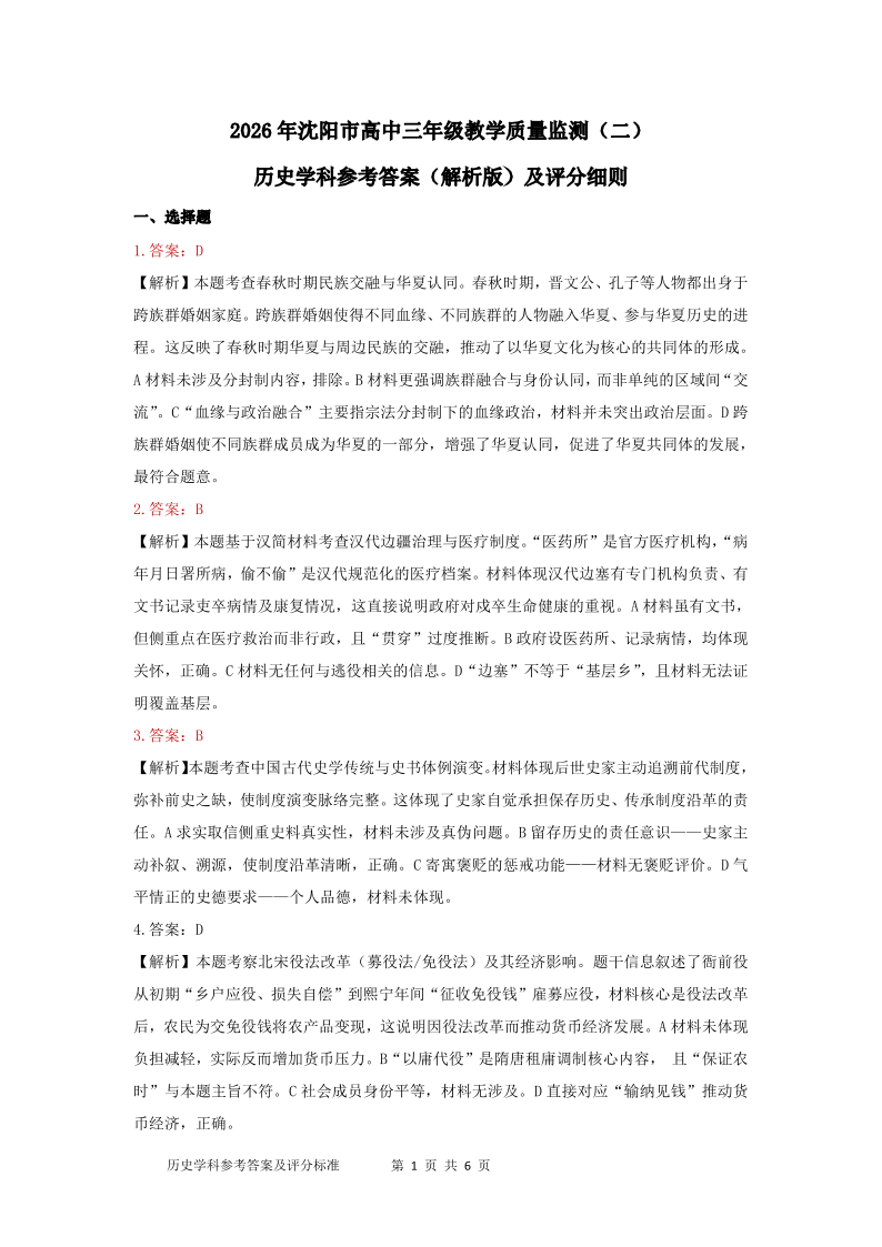 2026年沈阳市高中三年级教学质量监测(二)历史答案.pdf