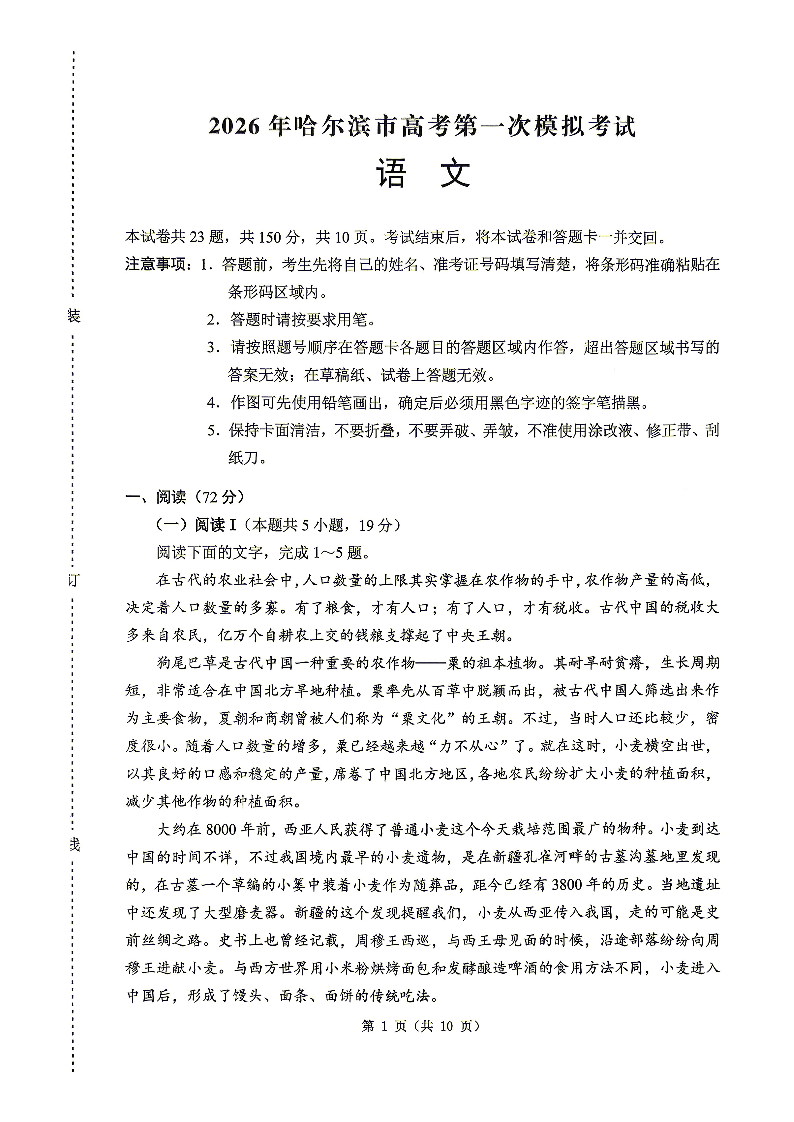 2026年哈尔滨市高考第一次模拟考试 语文.pdf