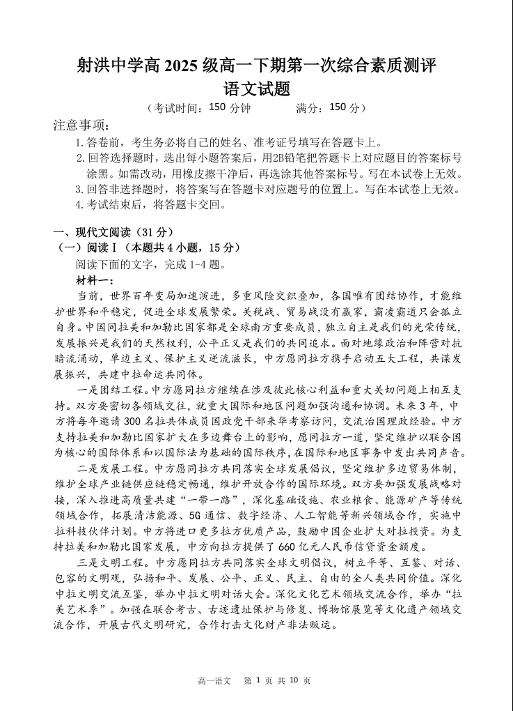 遂宁市射洪中学2025-2026学年高一下学期第一次综合素质测评 语文.docx