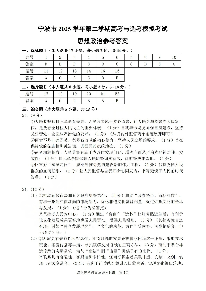 宁波市2025学年第二学期高考模拟考试 政治答案.pdf