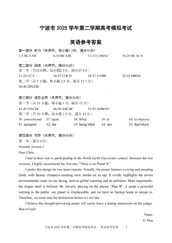 宁波市2025学年第二学期高考模拟考试 英语答案.pdf