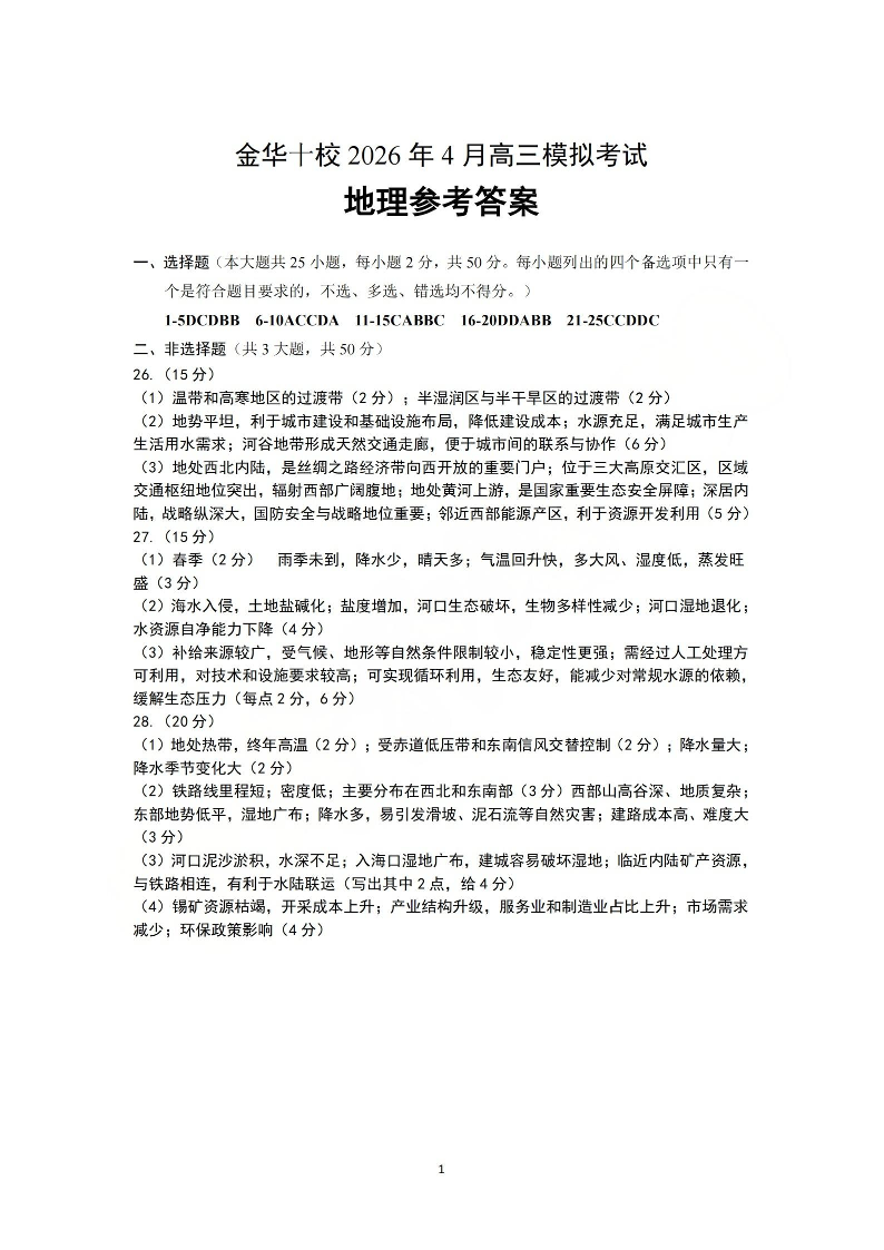 金华十校2026年4月高三模拟考试 地理答案.pdf