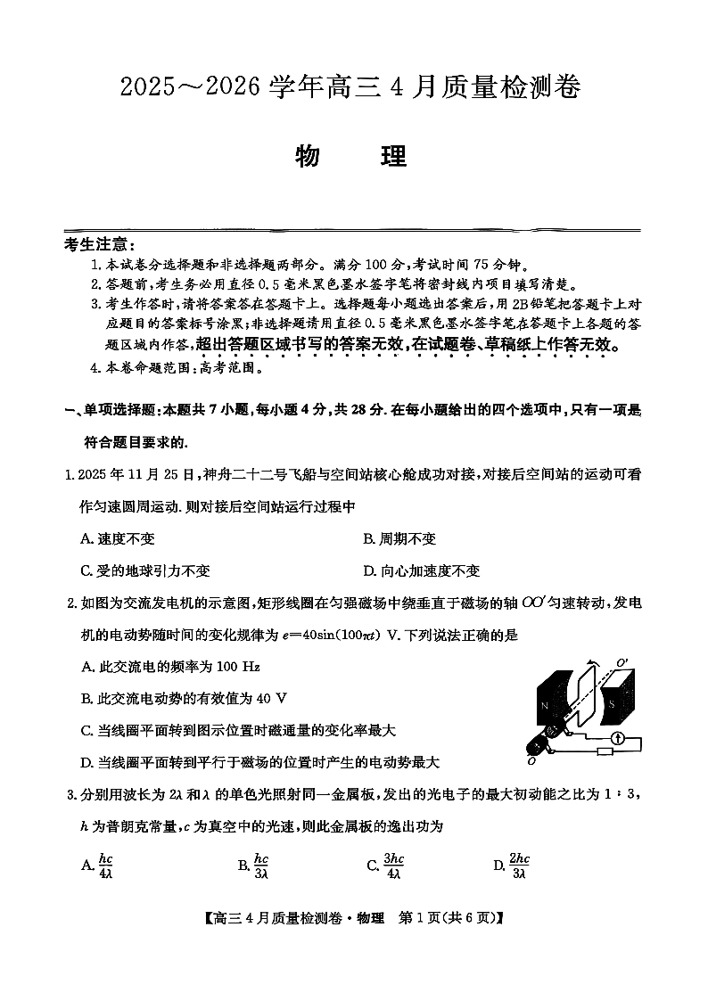 山西省卓越联盟2025~2026学年高三4月质量检测卷 物理.pdf