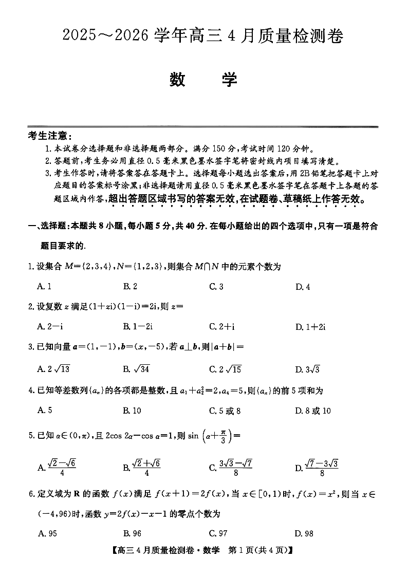 山西省卓越联盟2025~2026学年高三4月质量检测卷 数学.pdf