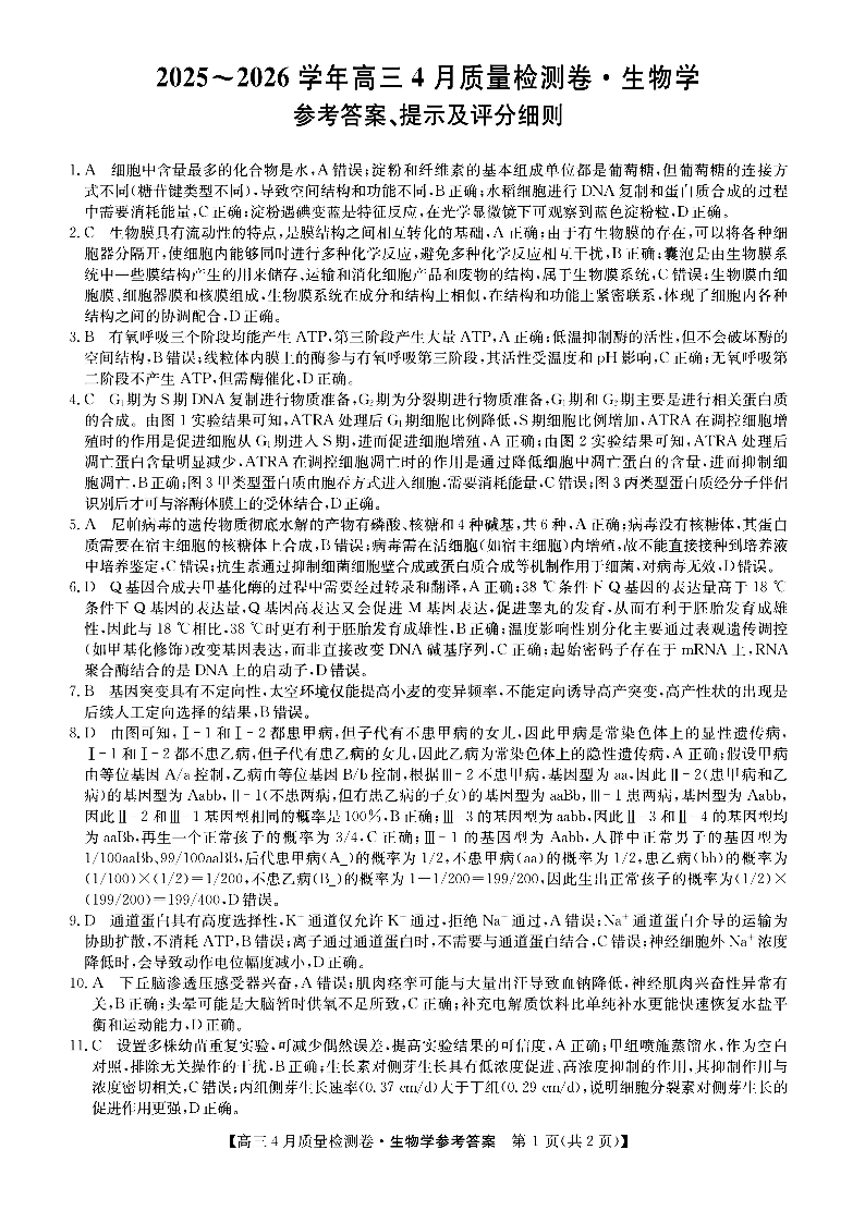 山西省卓越联盟2025~2026学年高三4月质量检测卷 生物答案.pdf