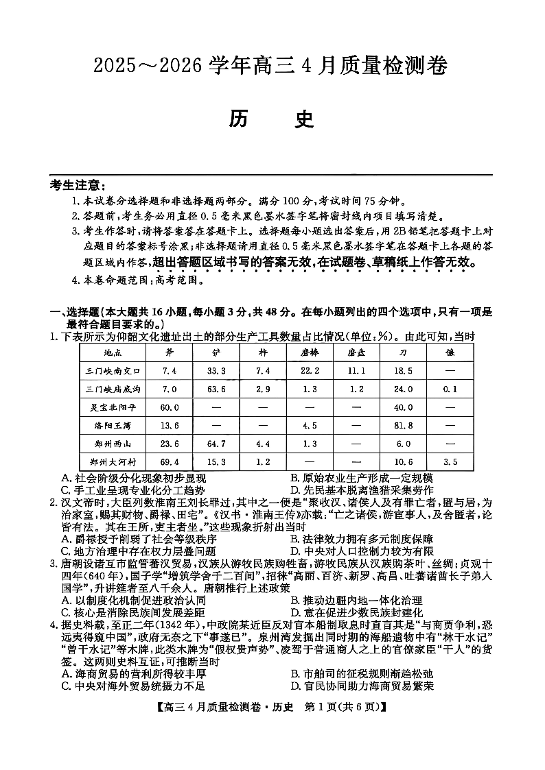 山西省卓越联盟2025~2026学年高三4月质量检测卷 历史.pdf