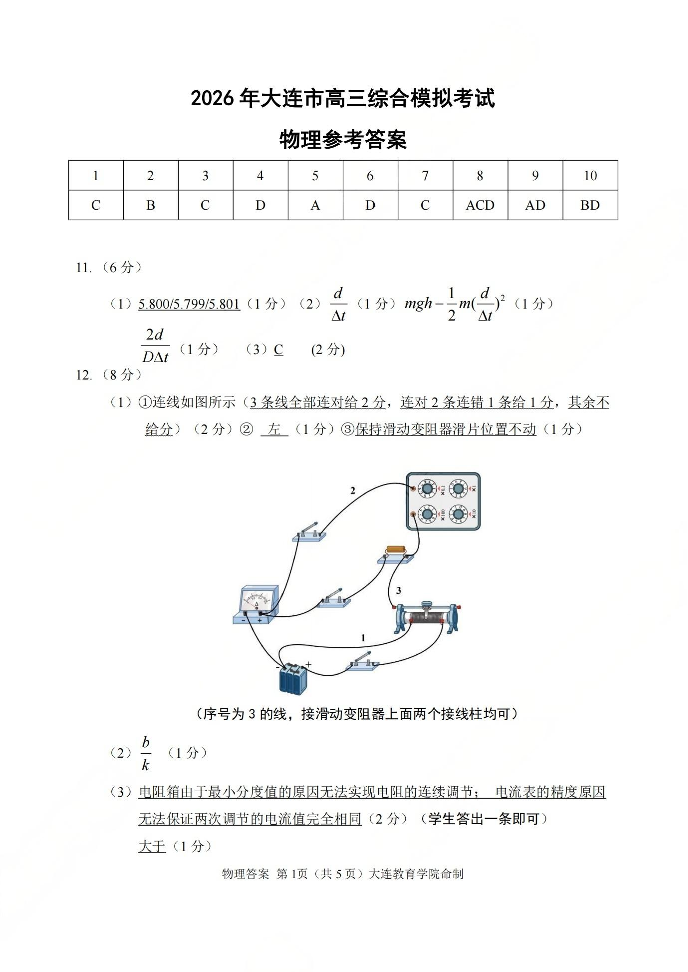 2026年大连市高三综合模拟考试 物理答案.pdf