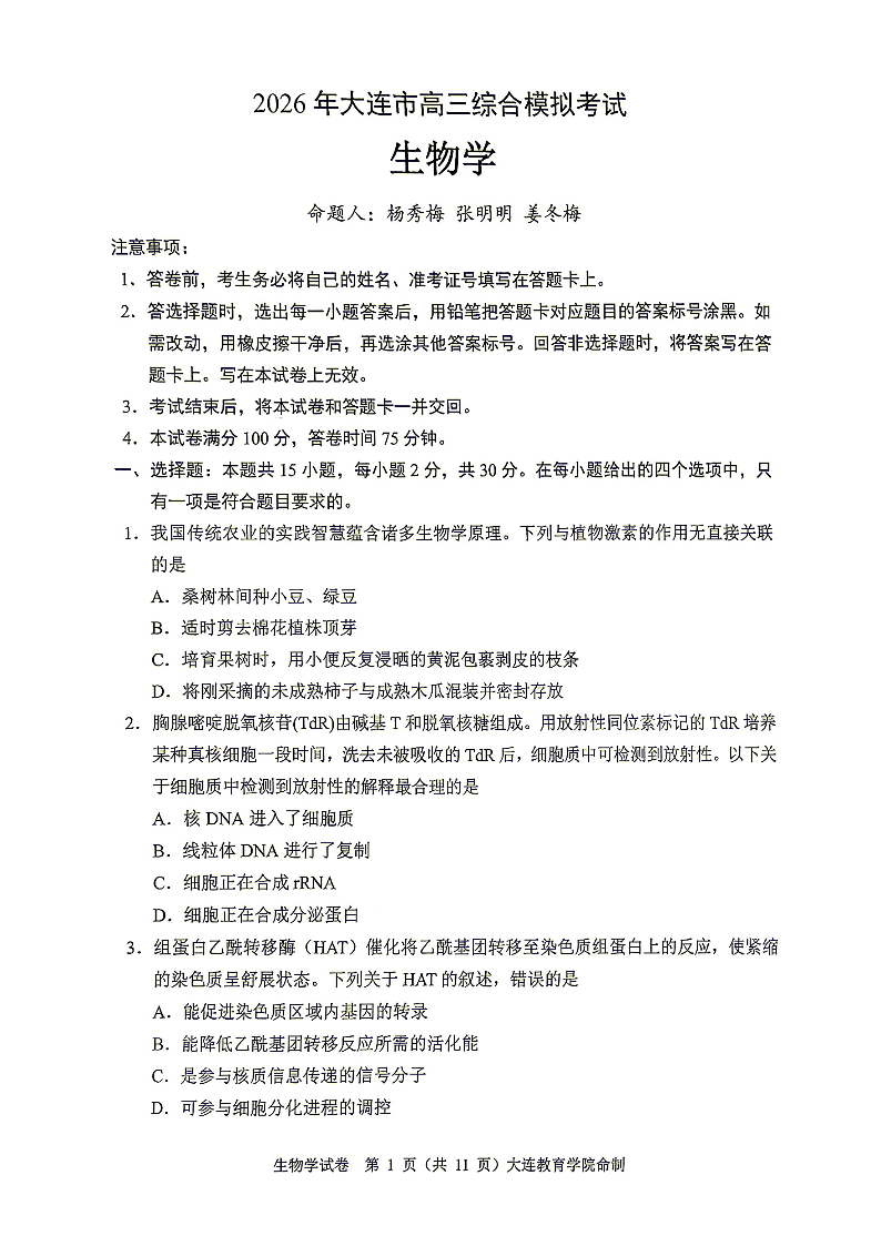 2026年大连市高三综合模拟考试 生物.pdf