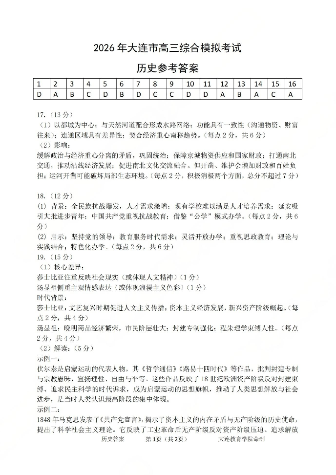 2026年大连市高三综合模拟考试 历史答案.pdf