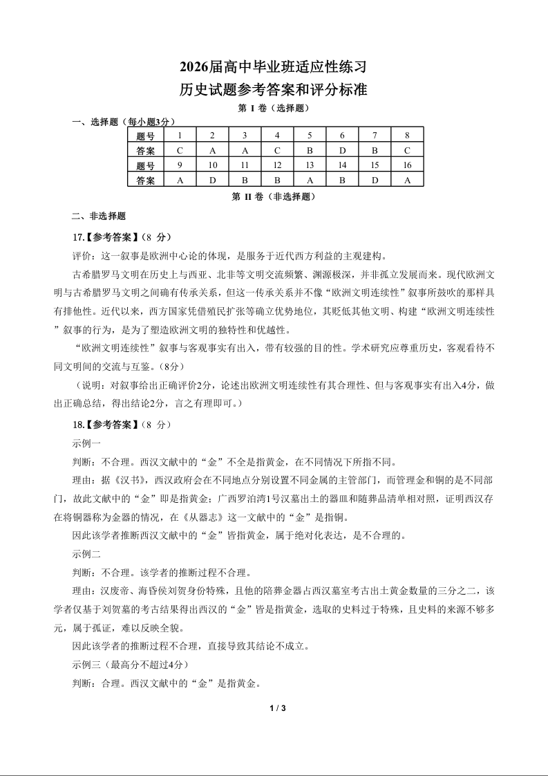 福州市2026届高中毕业班4月适应性练习 历史答案.docx