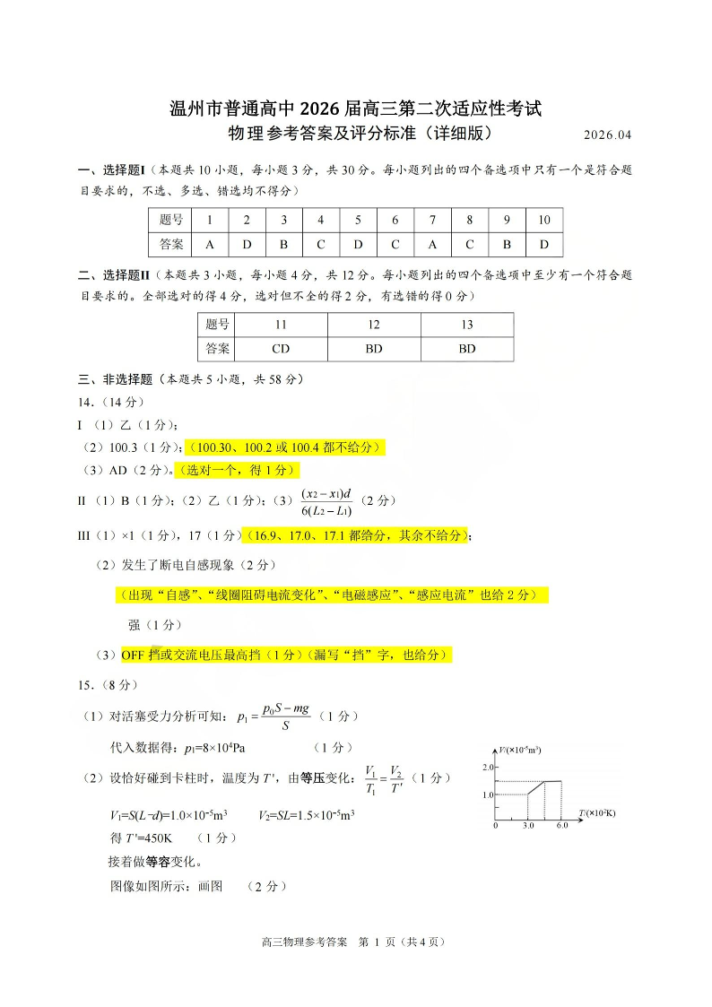 温州市普通高中2026届高三第二次适应性考试 物理答案.pdf