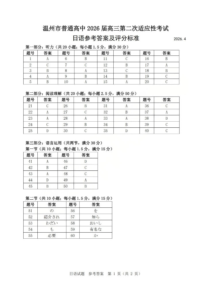 温州市普通高中2026届高三第二次适应性考试 日语答案.pdf