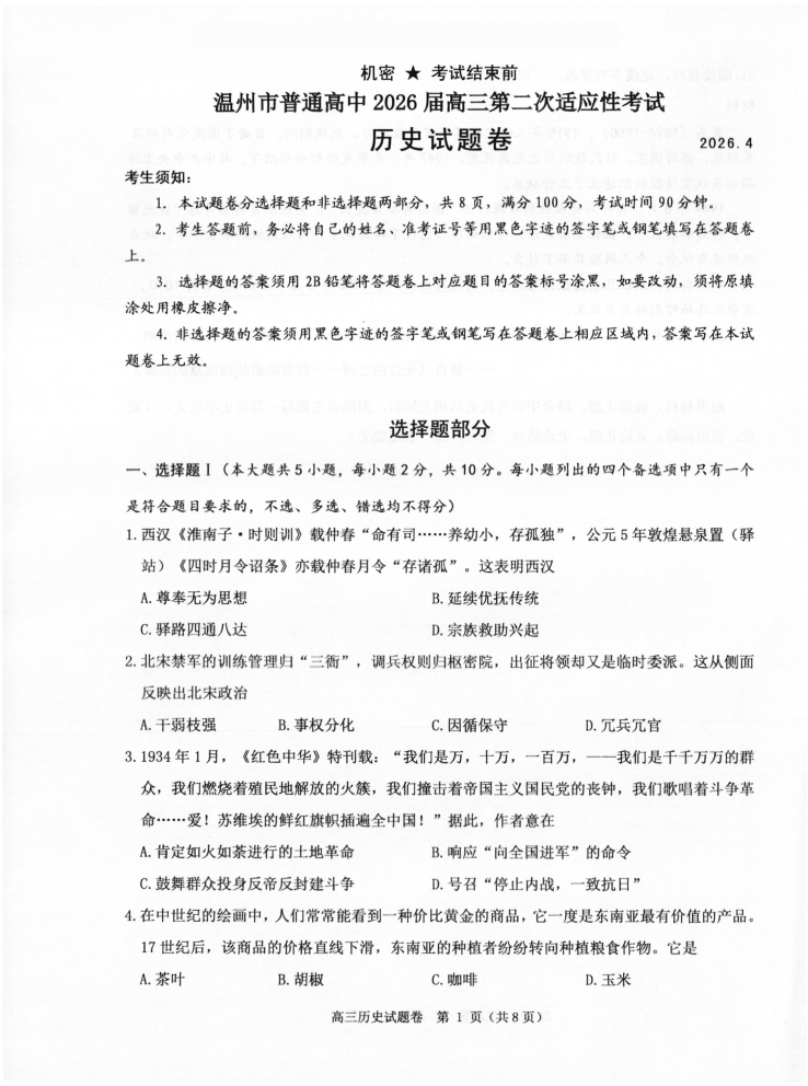 温州市普通高中2026届高三第二次适应性考试 历史.pdf