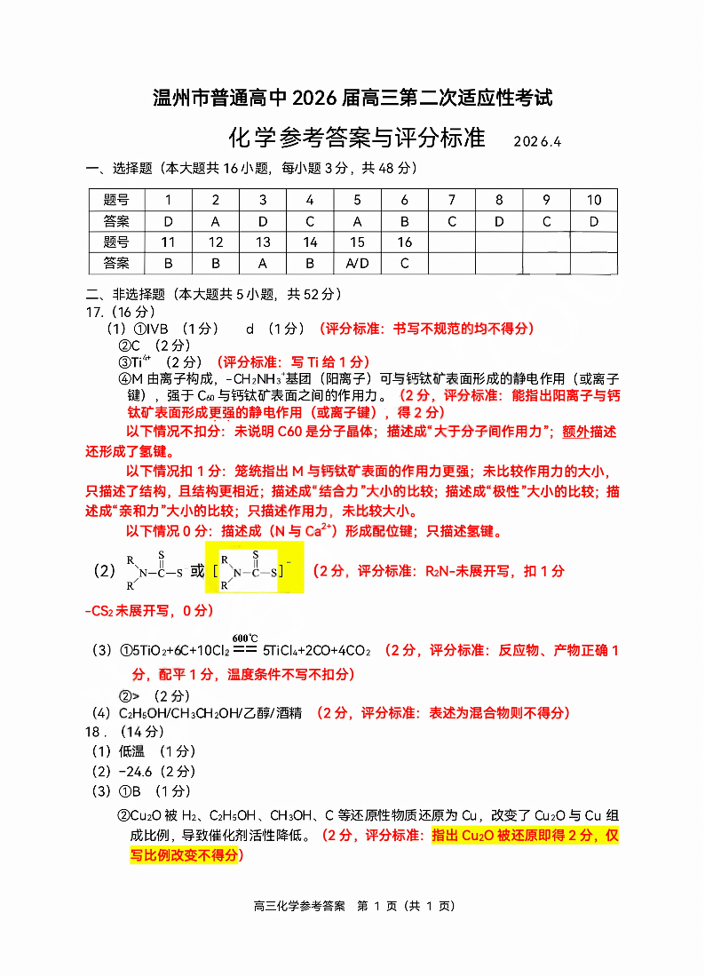 温州市普通高中2026届高三第二次适应性考试 化学答案.pdf