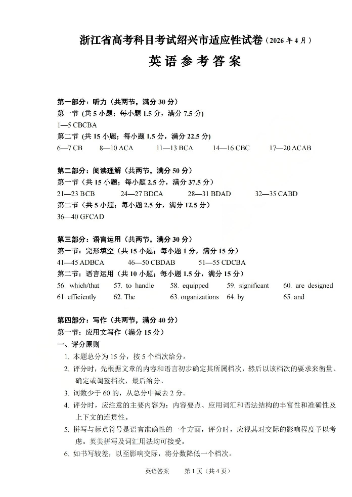 浙江省高考科目考试绍兴市适应性试卷 英语答案.pdf