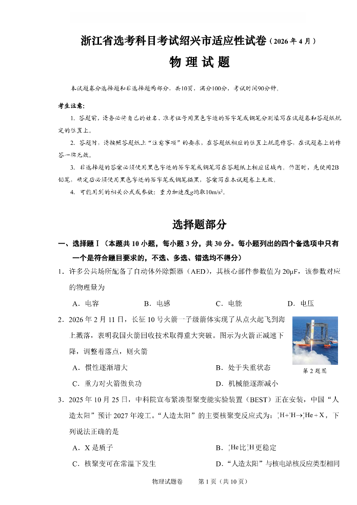 浙江省高考科目考试绍兴市适应性试卷 物理.pdf